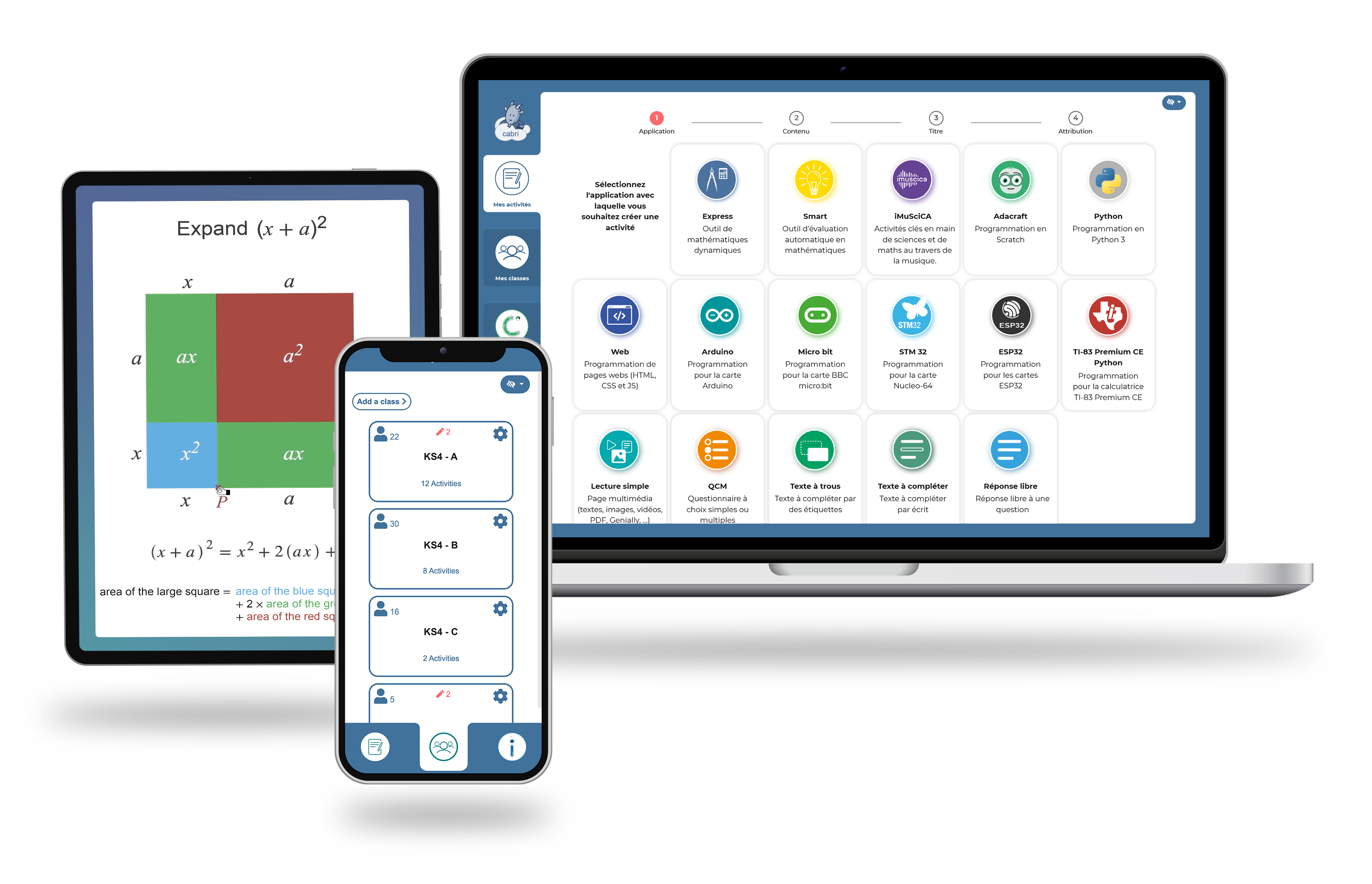 Des outils de mathématiques uniques incluant une calculatrice (scientifique et graphique), un éditeur d'équations et l'essentiel de la géométrie dynamique (2D et 3D).
